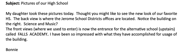 For those able to attend, we will first gather at our Jerome High School Auditorium; Saturday, September 11th 10:00 AM until 1:00 PM. (We will "Meet & Greet", tour the building, and virtually zoom with classmates still far away.) If unable to attend in person, join with us via ZOOM. Our Zoom room will open at 10:00 AM and remain open until we leave the building at around 1:00 PM. Instructions on joining and the "Zoom Meeting Link" are given within the blue highlighted line above. Just click on it and see what happens.